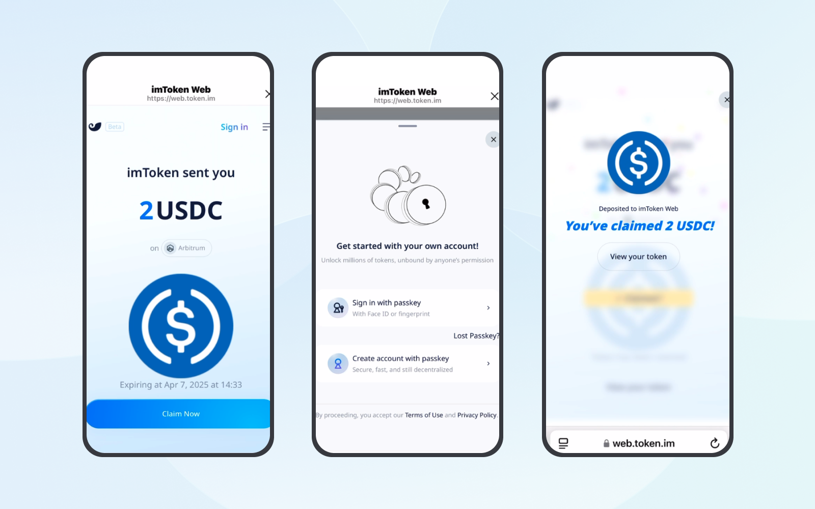 而 imToken Web 通过费用抽象技术打破了这一限制。用户无需支付领取 Token 的交易费用,即可直接一键领取,极大地提升了用户体验,降低了参与门槛。此外,Send via Link 的功能,让 Token 流转不再受制于发送者必须知晓接受者地址这一条件,而是紧密依托发送者的社交关系链,使 Token 更加具备「社交货币」的属性,可将其嵌入红包打赏、社区激励等真实社交行为。