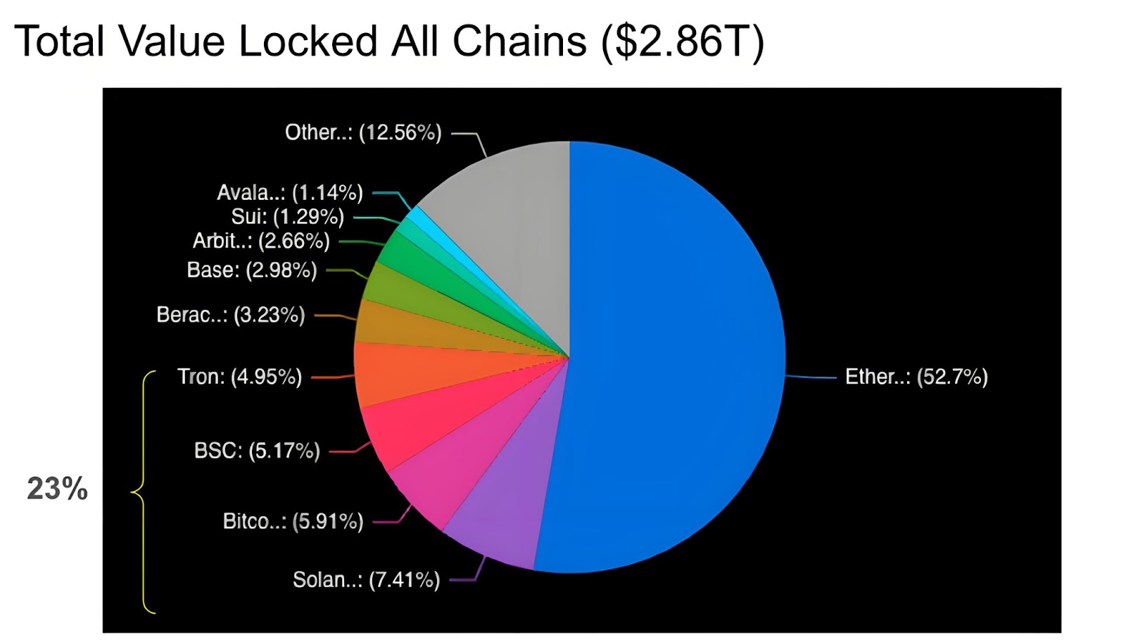 尽管面临诸多挑战,但以太坊仍然是区块链领域中最重要的生态之一。目前,整个加密货币市场的总锁仓量(TVL)约为 2860 亿美元,其中以太坊(主网+Layer2 网络)占据了约 60% 至 70% 的份额。这说明了,当前市场上的绝大部的资产仍然是沉淀在以太坊上。