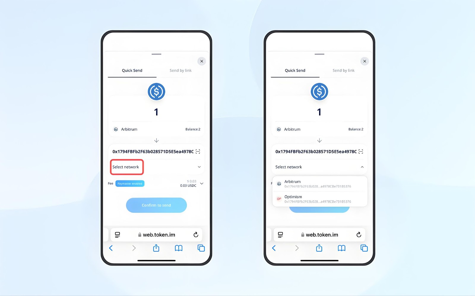 在跨 Layer2 的 Token 转账方面,imToken Web 也提供了极大的便利。用户可以通过两种方式指定转账地址所在的网络: